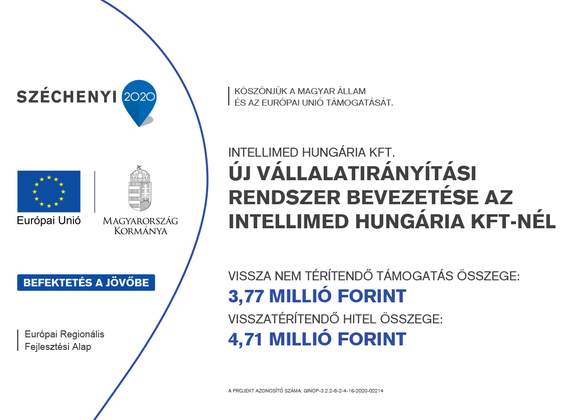 The INTELLIMED HUNGARY Ltd. has been awarded a non-refundable EU grant of HUF 3,767,600 and a repayable, preferential loan of HUF 4,709,500 through the Economic Development Operational Program (GINOP). The project - "Introduction of a new enterprise management system at INTELLIMED HUNGARY Ltd. (GINOP-3.2.2-8-2-4-16-2020-02214)" - aims to completely renew our ERP system and simultaneously establish electronic sales channels.